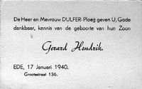 Dulfer - Gerard Hendrik (1940-2003) !!!!! IN ONTWIKKELING !!!!! Hij werd geboren op 17 januari 1940 te Ede als eerste kind van Johannes Hendrik Dulfer (1912-1982) en Alida Woutera Ploeg (1908-1998). Hij was twee maanden te vroeg. Het was een barre winter. Vader Henk vertelde stoere verhalen over zijn fietstochten naar het Julianaziekenhuis aan De Stationsweg om een fles moedermelk te bezorgen. Vanaf de kleuterschool was Gerard bevriend met Klaas Hoogenboezem. Die vriendschap werd voortgezet. Ze zaten ook samen op de lagere school (1946-1952). Omdat vader Henk in 1952 een baan in Utrecht kreeg bezocht hij de 2de Christelijke H.B.S. in Utrecht. De laatste twee jaar van zijn middelbare schoolperiode (1956-1957) bracht hij door aan het Christelijk Lyceum in Veenendaal. Zijn ouders woonden toen in Wageningen. Dat betekende dus dagelijks een fietstocht van 13 km heen en terug. Na zijn eindexamen HBS-B ging hij in 1957 natuurkunde en wiskunde studeren aan de Vrije Universiteit in Amsterdam. Na zijn doctoraal examen in 1966 kon hij promotieonderzoek gaan doen in een nieuwe onderzoekgroep van Dr Henk Verheul. Hij promoveerde in mei 1971 op een onderwerp uit de kernfysica. Zie verder informatie over opleiding elders. Klaas en Gerard studeerden gelijktijdig in Amsterdam en waren lid van dezelfde studentenvereniging (SSRA) en hetzelfde dispuut (RENATVS). Inmiddels had Gerard op de AZON-kursus 1964/65 in Baarn Lucie Luijendijk ontmoet. Zij verloofden zich op 18 december 1965en trouwden op 21 juli 1968 in Baarn.