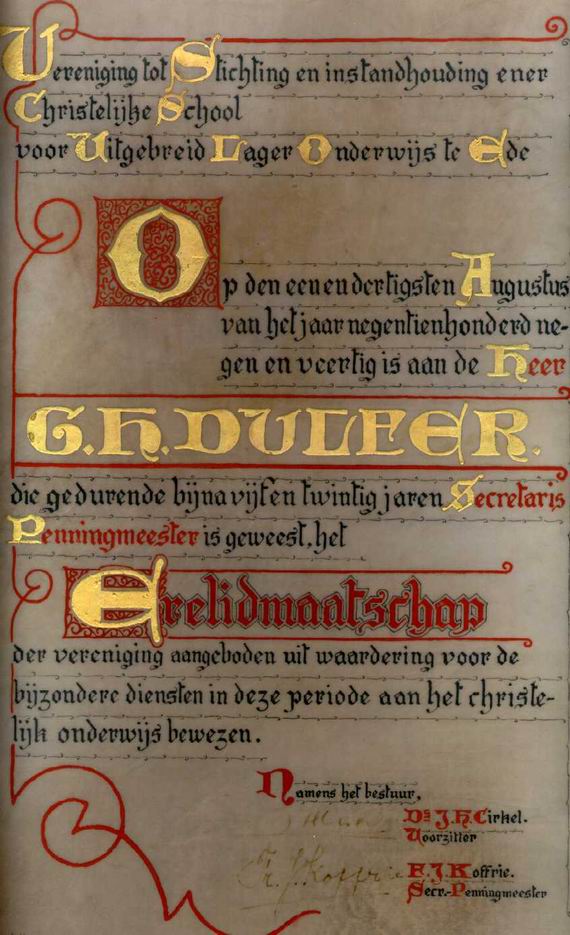 Oorkonde ter gelegenheid van benoeming tot erelid van vereniging Chr. ULO school te Ede.