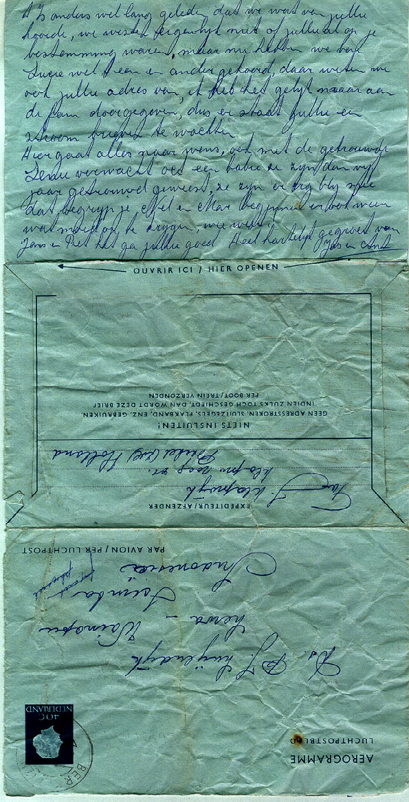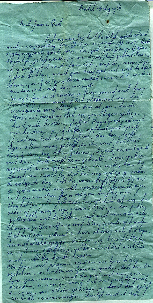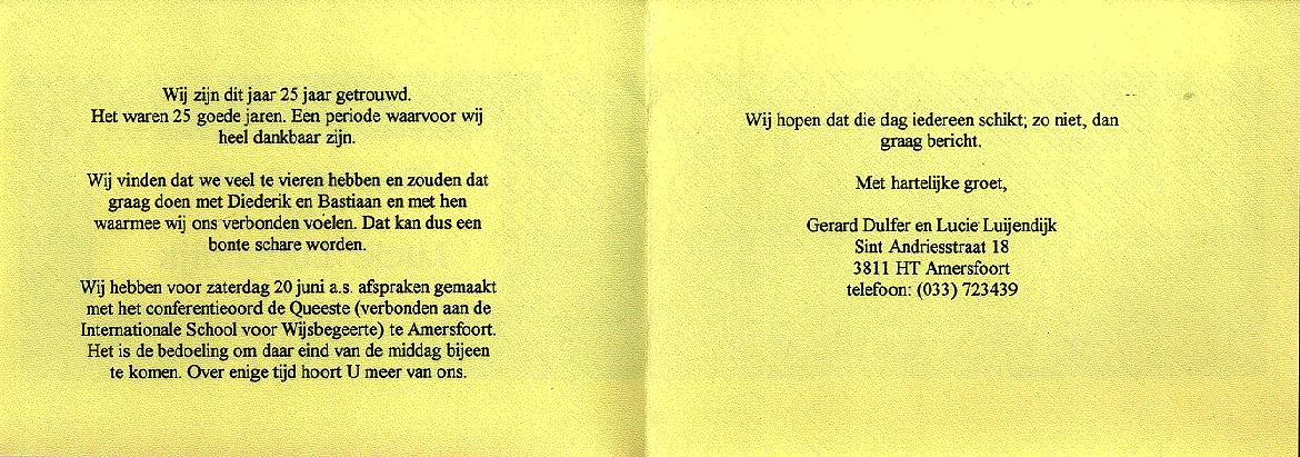beschikbaar; ook bestaan er nog foto's. Verloofd (december 1965) Op 18 december 1965 verloofden Gerard en Lucie zich (zie verlovingskaartjes links). In De Spreng, een chinees restaurant op de grens van Ermelo en Putten, werd een feestelijke bijeenkomst gehouden (zie details van het menu en foto's). In de verlovingstijd bezochten zij Lucie's familie in Berkel. Natuurlijk gingen ze naar Oom Jas en Tante Ant Klapwijk - van der Meer (waar Lucie tijdens haar middelbare schoolperiode vaak een deel van haar zomervakantoe doorbracht; met veel plezier!) en naar Oom Jaap en tante Mien van Etten - Klapwijk (waar Lucie in die periode ook regelmatig en met veel plezier kwam). Na dit bezoek schreven Jas en Ant op 18 augustus 1966 aan Piet en Jans Luijendijk-Klapwijk: "Ja, verleden week zondag is Lucie geweest met haar verloofde. We vonden het allemaal een heel sympathieke jongen. Het was of we hem al jaren kenden." (zie voor- en achterkant van postblad). Ook Tante Gre Minekus-Luijendijk en haar kinderen in Apeldoorn werden bezocht. De verhouding met Koos en Wim Smit-Ploeg (en daardoor ook met Lien Ploeg) bleef moeilijk. Huwelijk (juli 1967) De voorbereidingen voor het huwelijk begonnen eigenlijk al in 1965. Vader en moeder Luijendijk legden - alvorens naar Sumba terug te keren - via een notariele verklaring vast dat zij hun instemming gaven voor het huwelijk. Zij gingen er vanuit dat wij (Lucie en Gerard) zouden trouwen voordat zij hun werk op Sumba afgesloten hadden. Ze wilden beslist niet dat wij ons huwelijk zouden uitstellen tot hun terugkeer. Omdat ouders in die tijd schriftelijk toestemming moesten geven voor het huwelijk van kinderen onder de dertig jaar legden zij hun instemming notarieel vast (zie archief). Het zag er lang naar uit dat vader en moeder Luijendijk niet bij het huwelijk aanwezig zouden zijn. In maart 1967 stelde Lucie's onderbuurvrouw op de Hobbemakade, Mw Brinkman, in een brief aan vader en moeder voor dat zij op Sumba een paar foto's van hen beiden in feestkleding zouden laten maken en de negatieven opsturen. Mw Brinkman wilde dan een vergroting laten maken en die tijdens de kerkelijke bevestiging van het huwelijk op een tafeltje in de kerk te zetten. Bij de voorbereidingen gingen Lucie en Gerard er vanuit dat vader en moeder niet aanwezig zouden zijn. Daarom werd aan Ds Barend Richters, de directeur van het Zendingscentrum, gevraagd als predikant de kerkelijke bevestiging van het huwelijk te leiden. Toen bleek dat hij om gezondheidsredenen niet in staat was om aan dit verzoek te voldoen, werd Dr Lou Onvlee (zwager van Dr Jelle Berg) gevraagd om deze taak op zich te nemen. Op voorstel van Dr Berg besloten Generale Deputaten voor de Zending uiteindelijk aan vader en moeder een gratis vliegticket aan te bieden. Daardoor konden zij het huwelijk bijwonen. Het huwelijk werd gesloten op 21 juli 1968 in het gemeentehuis van Baarn. De uitnodiging/trouwkaart werd door Gerard en Lucie zelf ontworpen (met advies van broer Jaap Dulfer). Daarna vond een kerkdienst plaats in de kapel van het Zendingscentrum in Baarn. Het huwelijk werd bevestigd door vader Piet Luijendijk . De preek ging over Psalm 71:3: "Wees ons tot een rots ter woning, waarheen we bestendig gaan kunnen, die U beschikt hebt tot onze redding, want onze rots en vesting zijt Gij." Zie liturgie en preek in archief. Na de dienst was er receptie in het Zendingscentrum (zie fotoalbum) en een Indonesische rijsttafel. Helaas konden de andere 'vader en moeder' van Lucie, Dr Jelle en Eppie Berg-Miedema, wegens vakantie niet aanwezig zijn. Hun plaats werd ingenomen door Dr Lou en Wieke Onvlee-Miedema. Wieke las daarbij de toespraak van Eppie Berg-Miedema voor. Die toespraak geeft een mooi beeld van Lucie in de periode 1953-1958, toen ze bij het gezin Berg onderdak vond. Kinderen (1968, 1973) Uit het huwelijk werden twee zonen geboren: Diederik Pieter Hendrik