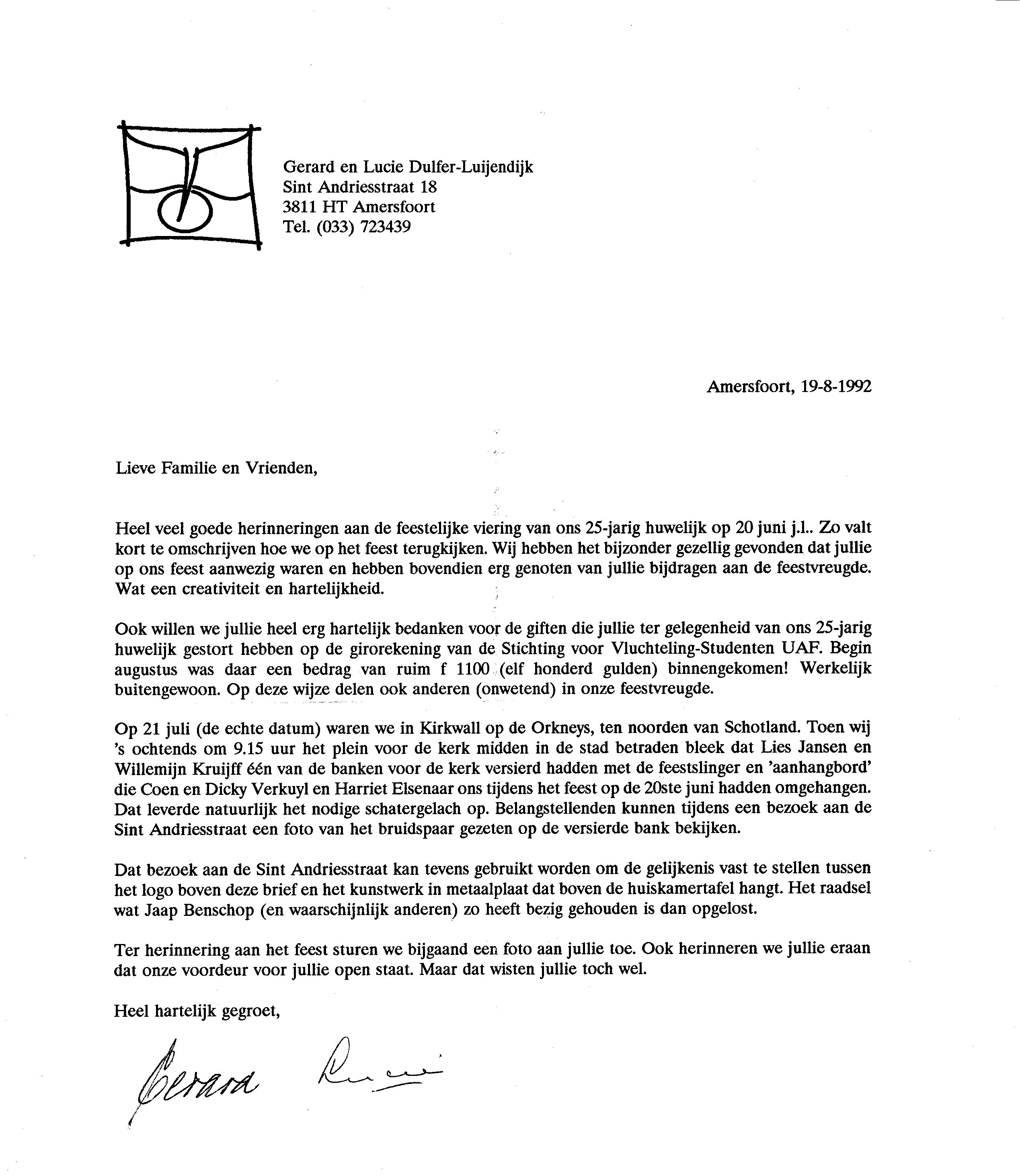 Uitnodiging Voor dit huwelijk werd met hulp van Bastiaan het logo ontworpen dat in het vervolg het briefpapier van Gerard en Lucie zou sieren. Het logo werd geinspireerd door het metalen kunstwerk dat zij in het begin van de zeventiger jaren in Yogyakarta kochten. De interpretatie van het kunstwerk heeft bij bezoekers vele verschillende gedachten opgeroepen. Voor ons is het een ontluikend zaad in de aarde, waaruit leven ontspruit. Zilveren huwelijk in De Queeste te Amersfoort Het feest werd gehouden in het Conferentieoord De Queeste aan de Dodeweg in Amersfoort op 20 juni 1992. De gasten kwamen uit de diverse kringen waarin Lucie en Gerard - al dan niet gezamenlijk - bewogen: familie, persoonlijke vrienden, buren, vrienden uit de wereld van het werk (VU-Ontwikkelingssamenwerking en Zending en Werelddiakonaat). Het was een buitengewoon geanimeerd feest met fantastische bijdragen van de aanwezigen. In het archief bevindt zich een uitgebreide verzameling documenten over de voorbereidingen en het feest zelf, w.o.