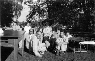 Ziekenhuis Ljungby Vanuit Zweden begin hij brieven te schrijven naar zijn vrouw Ali. Op 8 juni 1945 arriveerde het eerste bericht in Ede. De brieven die hij vanuit Zweden schreef zijn bewaard gebleven. Voor meer informatie over zijn verblijf in Zweden, zie de uitgetypte versie van deze brieven zweden1_9.htm) Zie ook Fotos uit Ljungby (Zweden 1945) Na de oorlog Oude bekende: Dirk Rustema was zendamateur in Middelstum(GR) met als roepletters PA0DR. Hij werd gearresteerd omdat hij, net zoals hij al jaren gewend was, in de ochtend met zijn zender kontakt had met een engelse radio vriend. Vader ontmoete hem in Sachsenhausen. Ook hij liep mee in de hongertocht na de ontruiming van het kamp. PA0DR overleefde de oorlog en werd een bekend radioamateur door zijn bijzondere antenne bouwsels. Marie Rustema-Klugkist was de Weduwe van Dirk Rustema. Op 31 oktober 1945 werd Henk door de Vertegenwoordiging Ede van het Nederlandse Beheersinstituut ingevolge het Besluit Vijandelijk Vermogen aangesteld als beheerder van het vermogen van de kunstschilder Jan Coenraad Nachenius, die op dat moment gedetineerd was in Westerbork. Zijn zoon Herman (1925) had dienst genomen in het Duitse leger en was op 15-2-1945 omgekomen in Polen. (Noot: In Amsterdam was een bankierskantoor Nachenius en Zoon gevestigd. ) In 1965 ging Henk met Gerard, Yke Marij en Marianne nog een keer naar Zweden terug. In ... werd aan Henk het Verzetsherdenkingskruis toegekend. Pas op latere leeftijd werd de invloed van de oorlog op Henk duidelijk. Hij werd Invloed van gevangenschap Alice zei in 1983 (na overlijden): Vader merkte toen, en het was een openbaring, dat socialisten ook mensen waren. Zie ook brief van Henk uit 1977. Belevenissen van Ali Dulfer-Ploeg In het voorgaande kwamen vooral de belevenissen van Henk aan de orde. In Ervaringen in oorlogstijd komen Ali's belevenissen ter sprake. Op verzoek van Gerard en Lucie schreef zij in de tachtiger jaren een eigen verslag van de oorlogsperiode. Zij gaf daaraan de titel: "BELEVENISSEN VAN EEN GEZIN IN DE OORLOGSJAREN 1940 - 1945". Het kwam gereed in 1986. Ali was - binnen de grenzen die de zorg voor haar 3 kinderen stelde - actief in allerlei verzetsactiviteiten, w.o. het verbergen van een joodse burger (Suze de Vries), het verbergen van gewonde, geallieerde militairen, het vervoer van valse documenten, e.d. Een aantal van deze activiteiten (onderbrengen van Suze de Vries en vervoer van vervalste documenten) vond plaats op verzoek van, in samenwerking met, Wim en Koos Smit-Ploeg (zie o.a. opmerkingen over activiteiten van Wim Smit). Voor het verlenen van onderdak aan geallieerde militairen (zie bijv. Leo Heaps, The grey goose of Arnhem, Futura Publications Limited, London, 1976, ISBN 0 8600 7509 5) kreeg zij offici�le dankbetuigingen uit de U.S.A. en U.K. De joodse onderduikster Mevrouw Suse de Vries plantte voor Ali twee bomen in het Westerweel Woud in Palestina/Israel. Zie meer informatie over haar ervaringen. Voor brede achtergrondinformatie over de oorlogssituatie in Ede zie het boek van Th.A. Boeree, Kroniek van Ede gedurende de bezettingstijd, Drukkerij J.Frouws en Zn, Ede, 1949; zie enkele citaten uit dit boek) |