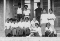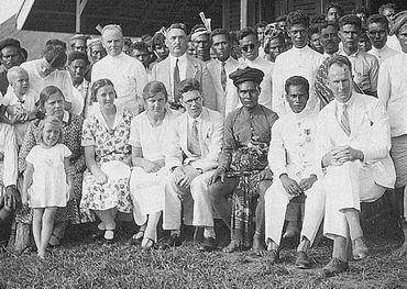 Ter gelegenheid van de begroeting van Ds en Mw Luijendijk (1933?) Voor namen van aanwezigen, klik op foto. Intussen werd voor hen in Anakalang een huis gebouwd door Go Peng Siong. Naast het huis stond een apart kantoortje. Daar werkte ook de juru tulis. Op een dag sloeg de bliksem in de brievenweger. Er brak geen brand uit, maar er zat een gat in de brievenweger. Het huis in Anakalang is tijdens de oorlog door de Japanners verwoest/afgebroken (na de oorlog was het verdwenen). Later heeft men op de fundamenten van dit huis de kerk gebouwd (zie verslag van de periode 1954-1959). Anekdote verteld door Jans, opgetekend Juli 2000: Jans herinnert zich hoe Tjalling van Dijk op een dag te paard aankwam. Hij was zeer ge�rgerd omdat hij een veel te klein paard gekregen had. Zijn voeten sleepten over de grond. Ze ziet hem nog aankomen. Ze hadden soms drie jongens en negen meisjes, die deels als bedienden/hulpen werkten en daarnaast een 'huishoudkundige opleiding' kregen. Van de jongens zorgde er 1 voor de paarden, 1 de geiten (daarmee trok hij overdag rond; de geiten werden gehouden voor de melk), en 1 voor de tuin. Ze sliepen boven de beesten. De meisjes sliepen in de bijgebouwen. Het was soms moeilijk taken voor hen te verzinnen, zoals naaien en breien, wassen en strijken, keukenwerk, schoonmaken, etc. De meisjes werden vaak 'anak piara' (pleegkinderen) genoemd. Zie foto Anak piara uit 1933. Jans herinnerde zich (augustus 2002) dat ze eens op bezoek was bij