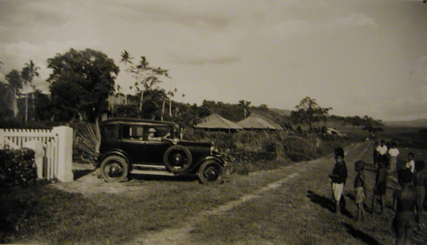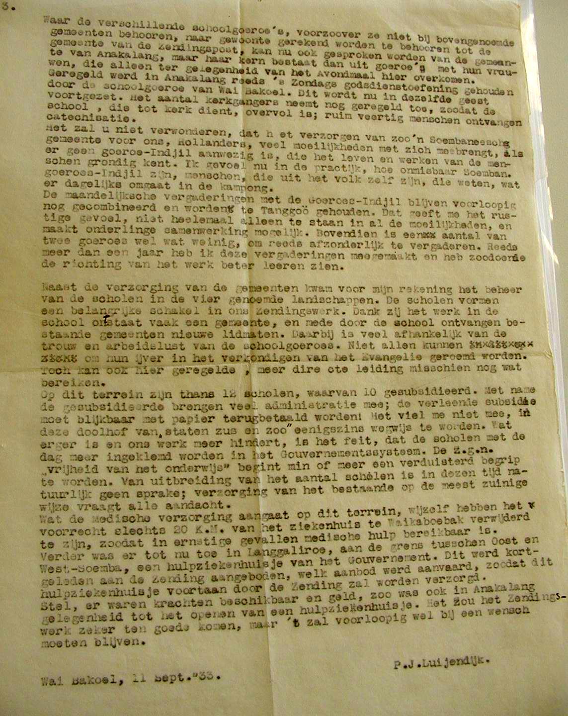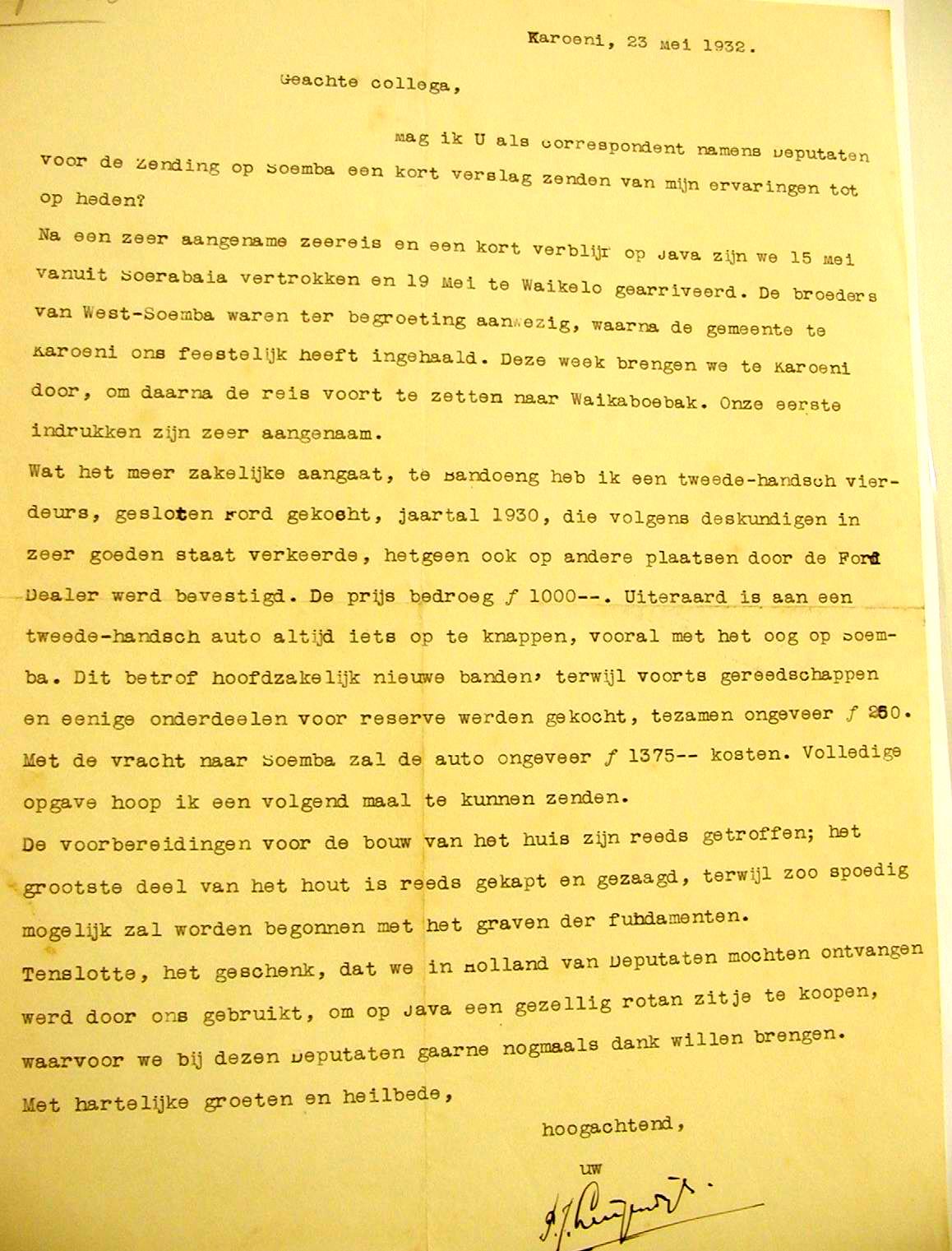 Luijendijk-Klapwijk Sumba 1932-1942 Vertrek naar Sumba (maart 1932) Piet en Jans Luijendijk-Klapwijk gingen op 24 maart 1932 in Genua (Italië) scheep op het motorstoomschip P.C. Hooft. Het schip voer via het Suezkanaal (zie ansichtkaart vanuit Isma�lia/Suez-kanaal naar de familie Vreugdenhil in Rotterdam), Colombo (Ceylon), Sabang (Sumatra), naar Batavia (Jakarta). 1) Jans won aan boord een wedstrijd waarbij deelnemers zeer grote spijkers in een houten balk moesten slaan. Ze won omdat ze de spijkers in haar hand hield (waardoor ze niet wegrolden). De prijs was een zilveren theezeefje, dat in de oorlog echter verloren ging. Zij kwamen op 14 april 1932 in Batavia aan. In Batavia werd gelogeerd bij Ds en Mw �. In Bandung kochten ze voor 1000 gulden een tweede-hands, vierdeurs, gesloten Ford van het bouwjaar 1930 (zie brief en foto). Vandaar reisden ze via Yogyakarta en Solo naar Surabaya. Vlak na Bandung kregen ze bijna een ongeluk, omdat de remmen bij een bergafdaling warm liepen. Daarom reden ze vanaf Solo met hulp van een lokale chauffeur. In Surabaya kochten ze o.a. "een gezellig rotan zitje". Op 15 mei voeren ze vanuit Surabaya met een boot van de KPM 2) naar Sumba. Ze gingen daar op 19 mei aan land bij Waikelo (West Sumba), waar ze opgewacht werden door "de broeders van West-Soemba". Het schip voer vandaar door naar Waingapu in Oost Sumba. Alleen op de rede van Waingapu kon grote bagage van het schip gehaald worden. Meubels, auto, e.d.. Voorbereiding op werk in West Sumba Op Sumba werd hun voortgezette 'vooropleiding' verzorgd door Dr Lou Onvlee (Soembanese taal en cultuur) en Ds Wybe van Dijk (lokale en kerkelijke situatie), beiden woonachtig in Waikabubak. Dr Lou Onvlee was uitgezonden door het Nederlands Bijbel Genootschap voor het bestuderen van de Soembanese taal). Ds Wybe van Dijk was zendingspredikant. Hij had de verzorging van heel West Sumba op zijn schouders. Piet kreeg daarvan later het oostelijke deel, waarin ook de plaats Anakalang lag. Huisvesting en huishouden Piet en Jans waren het eerste jaar in de kost bij de familie Onvlee, die woonden bij Pal Satu (bij paal 1) in Waikabubak. Piet kreeg les in taal en cultuur. Ze woonden in een klein huisje met twee kamers waarin eerder Eppie Berg gekuurd had voor haar TBC. De mandikamer was in de bijgebouwen. Er was geen keuken; dus eten bij de familie Onvlee. Zie ook foto's van hun eerste huisje. Tussenvoegsel: In het boek van D.K. Wielenga, De Zending op Soemba, herziene druk 1949 wordt op pagina 224 verteld: "Ds Luijendijk zou zich vestigen in het landschap Anakalang aan de autoweg Waingapoe-Waikaboebak, op 21 km afstand van de laatste plaats. Voorlopig ging hij echter wonen te Waikaboebak om onder leiding van Dr Onvlee de taal te bestuderen en zich voor te bereiden voor zijn werk. In dien tijd werd onder toezicht van Ds Krijger een huis voor hem gebouwd te Wai Bakoel. Onder dien naam zal de tweede zendingspost in W. Soemba bekend staan." ??? Ama Piga, timmerman in Anakalang. Een hand gehandicapt.???