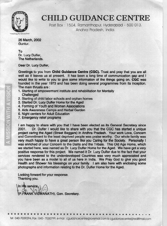 (2002) Introductie In 2001/2002 besloot het Child Guidance Centre (CGC) tot stichting van een opvanghuis voor bejaarde straatzwervers. Het huis kreeg de naam Dr Lucy Home for the Aged (afgekort LDH). Het Child Guidance Centre is een schepping van Dr Ranjan Babu en zijn zoon Frank Viswanth. Ranjan Babu was in 1985, samen met een collega, de eerste bezoeker uit India die Lucie in haar functie secretaris ZWD in Leusden bezocht. Lucie hoorde voor het eerst van LDH via een brief van Frank d.d. 23 maart 2002 (zie hieronder). Tijdens een bezoek van Frank aan Amersfoort op ... juli 2002 kreeg ze foto's van de opening van het LDH (zie hieronder) en wanddoeken gemaakt door bewoners van het LDH en leerlingen van het CGC. Brief aan