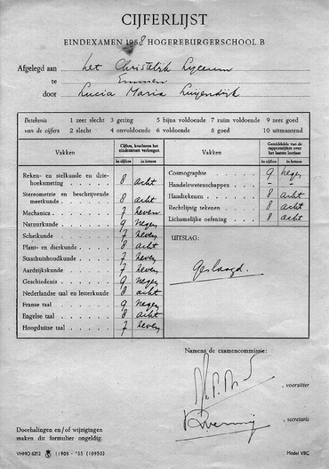 Luijendijk- Lucia Maria (1940-2002) Opleiding Lagere school De eerste stappen van haar schoolopleiding zette zij op de Lagere School met de Bijbel in Berkel. Van juni 1946 tot april 1948 verbleef zij met haar ouders bij Opa en Oma Klapwijk-Verhoeff. Na terugkeer op Soemba volgde ze IVIO afstandsonderwijsonderwijs. Vanuit Bandung werd lesmateriaal opgestuurd, inclusief toelichting voor de studie/huiswerkbegeleider, toetsmateriaal, etc. (zie voorbeeldenvan lesmateriaal in het archief). De toetsen werden naar de contactpersoon Bandung (Mw Hendriks-de Keyzer) gezonden ter beoordeling en advies. De taak van studie/huiswerkbegeleider berustte merendeels bij moeder Jans, maar soms -bij haar afwezigheid- bij vader Piet. Lucie kon overigens reeds vrij zelfstandig werken. Vader Piet schreef in 195x aan Jans (toen die voor enige dagen elders op Sumba verbleef): "Ze werkt goed en ijverig. Ze heeft anders heel wat af te werken op ��n dag." In 1953 vertrok het gezin terug naar Nederland. Moeder Jans herinnerde zich in 2002 nog helder dat ze bij aankomst in Surabaya (op doorreis naar Jakarta) bericht ontvingen dat Lucie geslaagd was voor het toelatingsexamen voor de middelbare school (zie archief). Middelbare school Na terugkeer in Nederland en nam het gezin intrek in een pension in Apeldoorn (Loolaan 8). Lucie ging daar naar de middelbare school aan de Jachtlaan. Omdat haar ouders in het voorjaar van 1954 naar Sumba terugkeerden en Lucie ondergebracht werd bij de familie Dr Jelle Berg in Boskoop (Laag Boskoop 7a) kon zij de eerste klas in Apeldoorn niet afmaken. In Boskoop bezocht zij de christelijke middelbare school in Alphen. Toen de familie Berg in 19.. naar Emmen (Prinsenlaan 56, later 40) verhuisde ging Lucie vanzelfsprekend mee. Ze bezocht in Emmen de Christelijke HBS, later Christelijk Lyceum. Ondanks de overstap naar een andere school behaalde ze zeer goede resultaten. Zie als voorbeeld haar rapporten en een repetitie meetkunde in dossier. Nevenactiviteiten o.a. blokfluitles, assistent leidster van een meisjesclub. Ze hield in 1955 een voordracht over haar leven op Sumba. Na de derde klas koos ze exact (de B-richting). Ze was (volgens haar vriendin Ans Kampherbeek) in de klas een rustig, onopvallend meisje. Ze was intelligent; vooral in de B vakken was ze heel erg goed. Toch had ze nog tijd voor andere activiteiten. Ze was o.a. lid van de redactie van de schoolkrant, volgde blokfluitles en was hulpleidster bij een meisjesclub (8-11 jaar). Ze deed in 1958 met goed gevolg eindexamen HBS-B (zie cijferlijst). N.B. De meeste meisjes kozen voor de niet-exacte richting. Lucie vormde