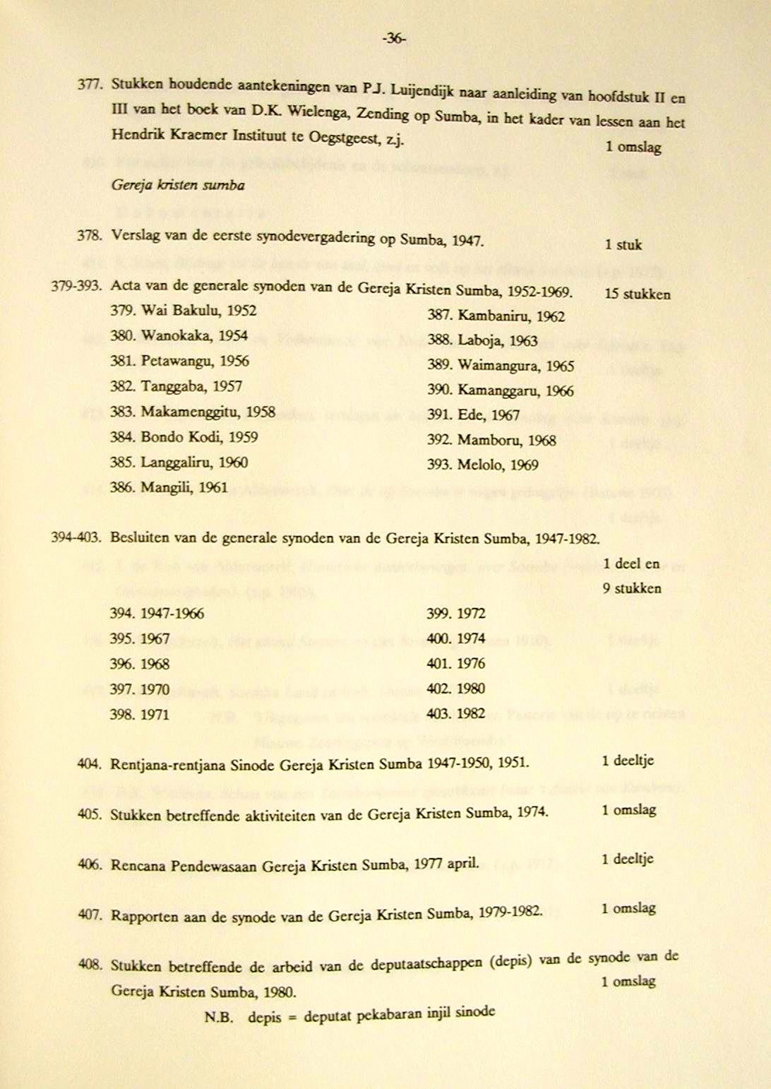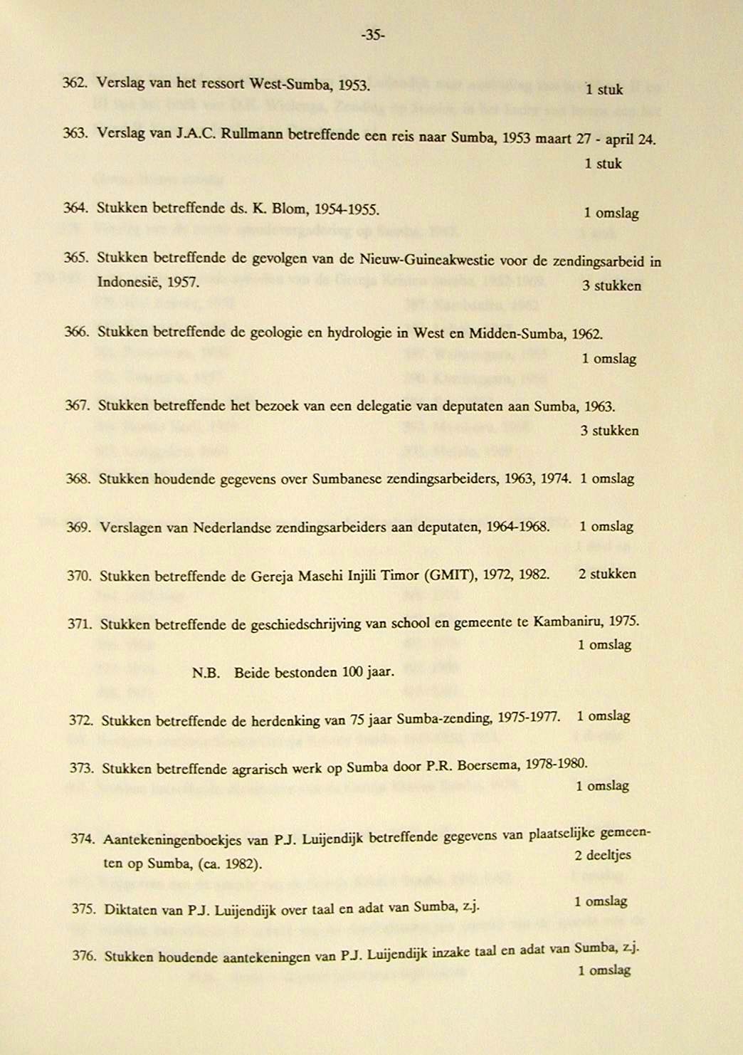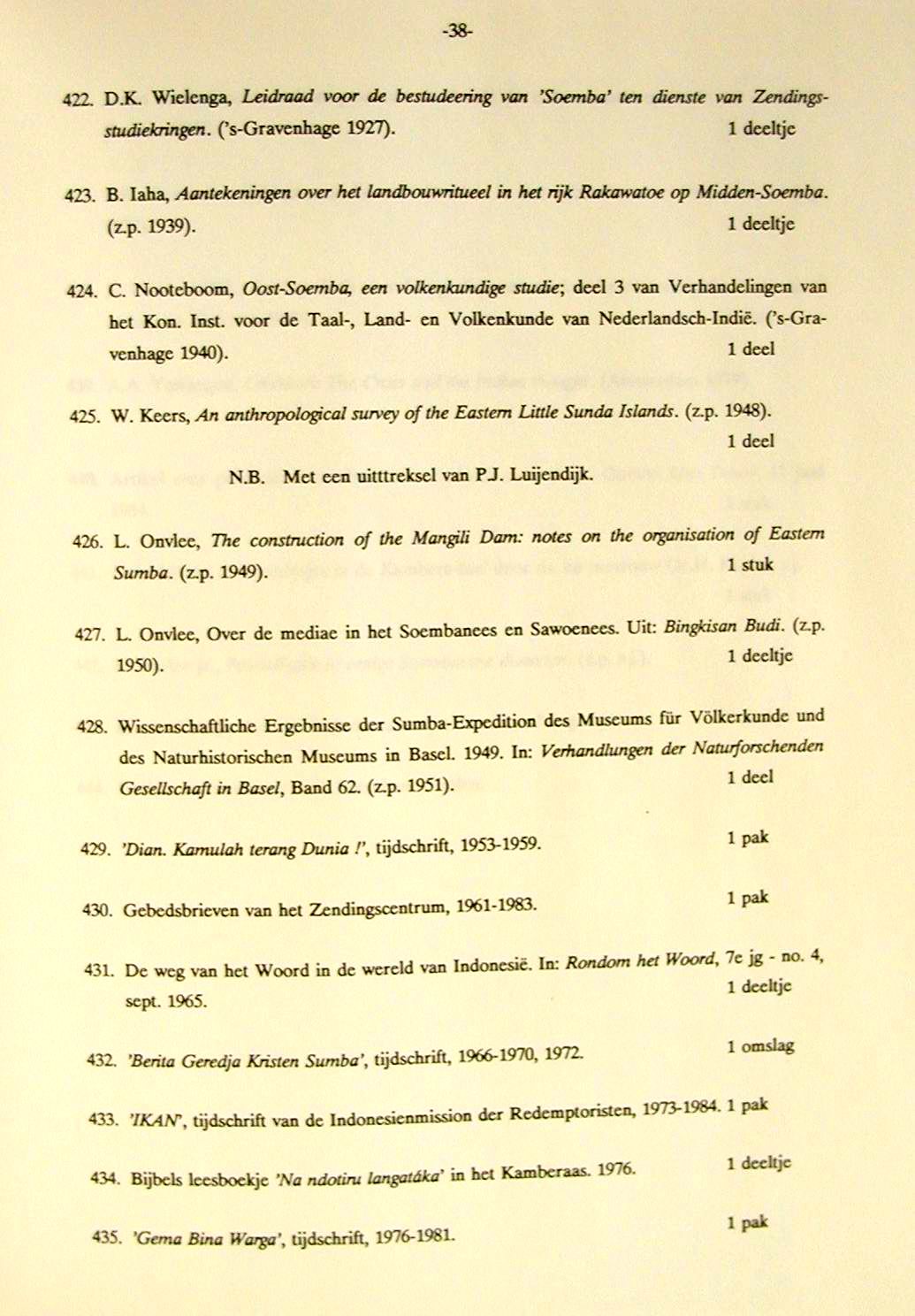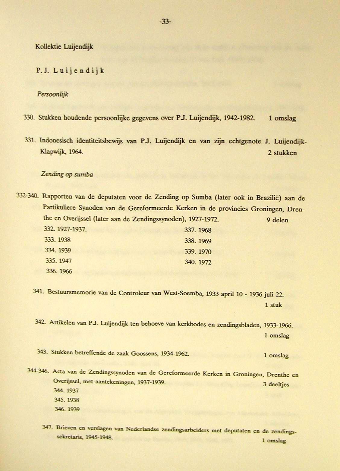 Piet Luijendijk (1907-1985) Publicaties 1. P.J. Luijendijk, Zeven jaar Zendingswerk op Sumba (1939-1946), J. Niemeijer�s Uitgeversmij, Groningen, 1946 (zie links brief van Jurri�n Veldkamp[1], Quaestor Soemba Zending, d.d. 15-02-1947over verspreiding) 2. D.K. Wielenga (herzien en bijgewerkt door T. van Dijk en PJ Luijendijk)[2], De zending op Sumba,1949 (herziene druk) 3. L. Onvlee i.s.m. Kapita H. Kapita en m.m.v. P.J. Luijendijk, Kamberaas - Nederlands Woordenboek, Foris Publications Holland/U.S.A., 1984 4. P.J.Luijendijk, Heeft het Zendingswerk nog wel zin?, ADS, 218 (zie vd End p. 527 voetnoot) Archief Deputaten voor de Sumba-Zending (ADS) 5. W.B. van Halsema e.a., De Zending Voorbij (Kok, 1995); verwijst o.a. naar verslag van PJL over de Japanse tijd op Sumba; zie p. 41 Archief P.J. Luijendijk In Het Utrechts Archief (het archief van de provincie Utrecht) zijn