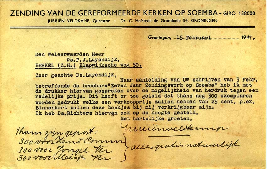 (zie brief in archief). Bronnen (referenties) 1. Th. van den End, Gereformeerde Zending op Sumba 1859-1972), Raad voor de Zending e.a., 1987. Publicatie van originele stukken: zie o.a. 165, 167, 176, 220, 221, 224(!), 236, 250, 251, 280, voor motivatie/gevoelens van PJ zie 224 punt 5 en 6 2. T. van Dijk en PJ Luijendijk (auteur van eerste uitgave was vanD.K.