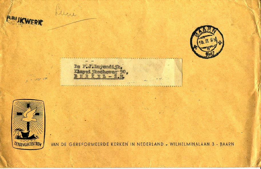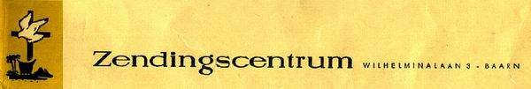 | Enveloppe (1947) Het Zendingscentrum in Baarn speelde een belangrijke coordinerende en begeleidende rol in het zendingswerk van de Gereformeerde Kerken. De verantwoordelijkheid voor de verschillende zendingsgebieden berustte bij de 'provincies'. Bijvoorbeeld, de gereformeerde kerken in Groningen, Friesland, en Drente droegen de veranwoordelijkheid voor het zendingsterrein Sumba. Het Zendingscentrum had de zorg voor het centrale beleid en voorlichting, alsook allerlei praktische en materiele kanten van de uitzending van medewerkers, zoals bijvoorbeeld het regelen van reizen, opvang tijdens verlofperiodes, etc. De eerste directeur Ds Barend Richters was een zeer geinspireerd en veelzijdig man. Voorbeeld van zijn veelzijdigheid was zijn deskundigheid op het gebied van fotografie en film. Voor Lucie Luijendijk was hij de 'held' van de kerstfeesten voor zendingskinderen; in Nederland achtergebleven kinderen van uitgezonden zendingsmedewerkers. Zij was enthousiast over de hartelijke en geestige wijze waarop Barend en zijn vrouw Mies deze feestelijke dagen leidden. Barend Richters organiseerde ook haar verblijf op Selly Oak College (Birmingham, Engeland) in het studiejaar 1958/1959. In die periode leerde zij Ds Anthon Vos kennen. Hij was in die tijd predikant van de Gereformeerde Kerk in Londen. Later volgde hij Barend Richters op als directeur van het Zendingscentrum. Lucie Luijendijk en Gerard Dulfer leerden elkaar kennen op de AZON-kursus 1964/1965 in Baarn; een Algemene ZendingsOpleiding voor Niet-theologische studenten.